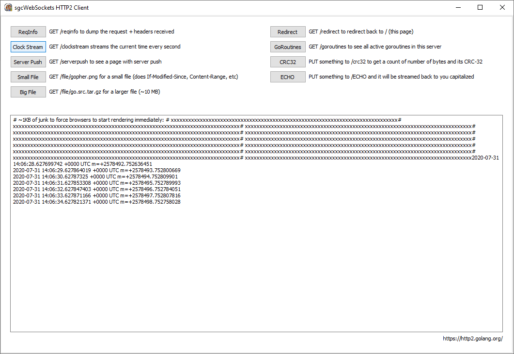 Find below a screenshot of the sgcWebSockets client HTTP2 demo running Clock Stream sample.