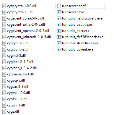 1. Some cygwin libraries required to run application, you must deploy these libraries with coturn server.