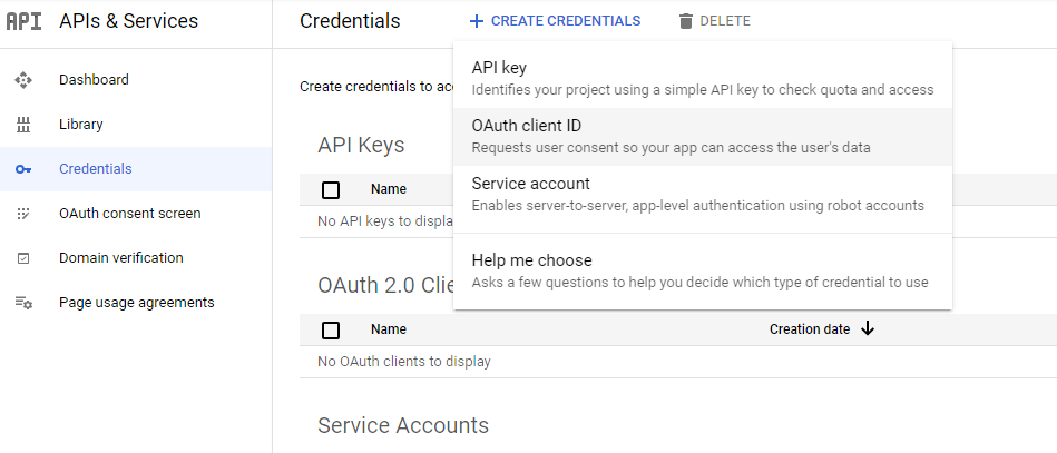 After that, go to Credentials menu and press the button CREATE CREDENTIALS, select the option OAuth Client ID.