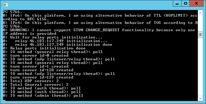 Once configured, you can run server just executing turnserver.exe, a new console application will be opened and a log file will be created. You can increase the verbose of console application (get more detailed messages) if you enable "verbose" in turnserver.conf file.
