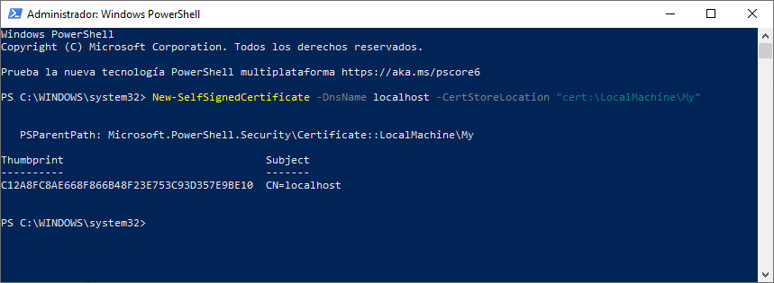 New-SelfSignedCertificate -DnsName localhost -CertStoreLocation "cert:\LocalMachine\My"